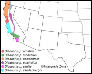 DISTRIBUTION: In our region, Diadophis p. pulchellus occurs in coastal California along the western slopes of the Sierra Nevada Mountains