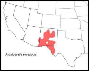 DISTRIBUTION: In our region, Aspidoscelis exsanguis occurs in southeastern Arizona, central and southern New Mexico and west Texas.