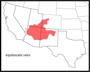 DISTRIBUTION: In our region, Aspidoscelis velox occurs throughout northern Arizona and New Mexico, and in southeastern Utah.