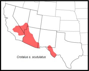 DISTRIBUTION: In our region, Crotalus s. scutulatus occurs in the Mojave Desert region of eastern southern California, southern Nevada, extreme southwestern Utah, western and southern Arizona, extreme southern New Mexico and the Trans-Pecos region of west Texas.