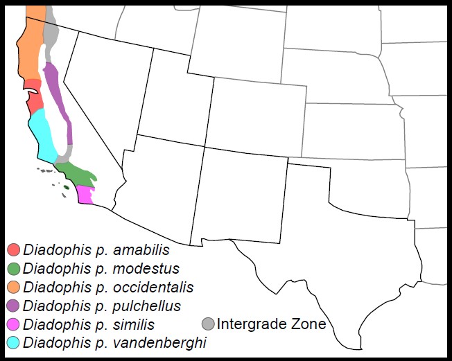 DISTRIBUTION: In our region, Diadophis p. pulchellus occurs in coastal California along the western slopes of the Sierra Nevada Mountains