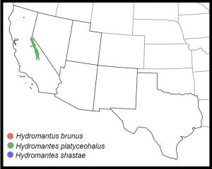 DISTRIBUTION: In our region, Hydromantes shastae occurs only in California in a small area in the Cascade Range near Lake Shasta, Shasta County.