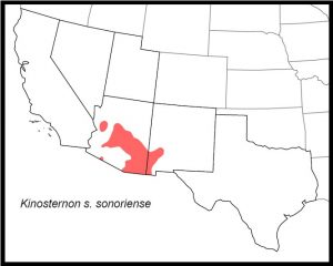 DISTRIBUTION: In our region, Kinosternon s. sonoriense occurs in central and southeastern Arizona and southwestern New Mexico.