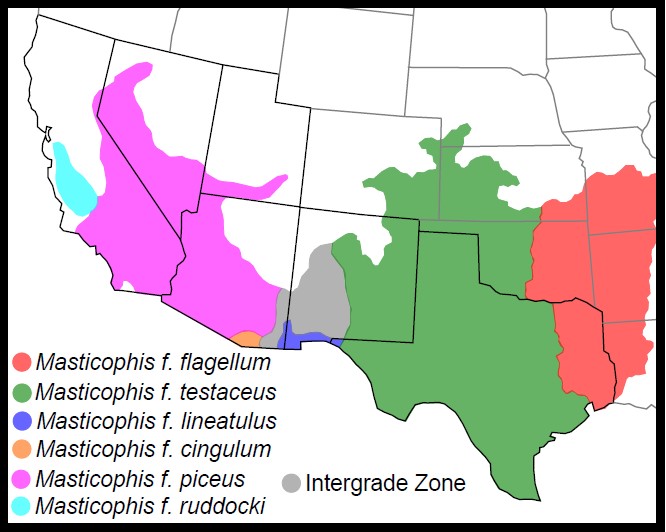 DISTRIBUTION: In our region, Masticophis f. piceus occurs in the coastal region of southern California and in the desert regions of Arizona, California, southern and western Nevada and southern Utah.