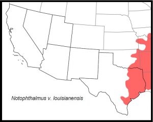 DISTRIBUTION: In our region, Notopthalmus v. louisianensis occurs throughout much of east and southeast Texas as far south as San Patricio County.
