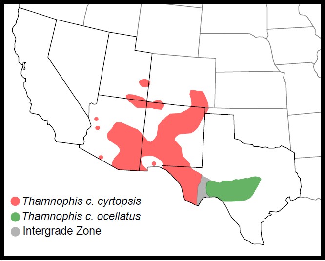 DISTRIBUTION: In our region, Thamnophis c. cyrtopsis occurs from the Trans-Pecos region of Texas westward throughout much of New Mexico, southeastern Arizona and in southeastern Utah. In addition, there are several small isolated populations in western Arizona.