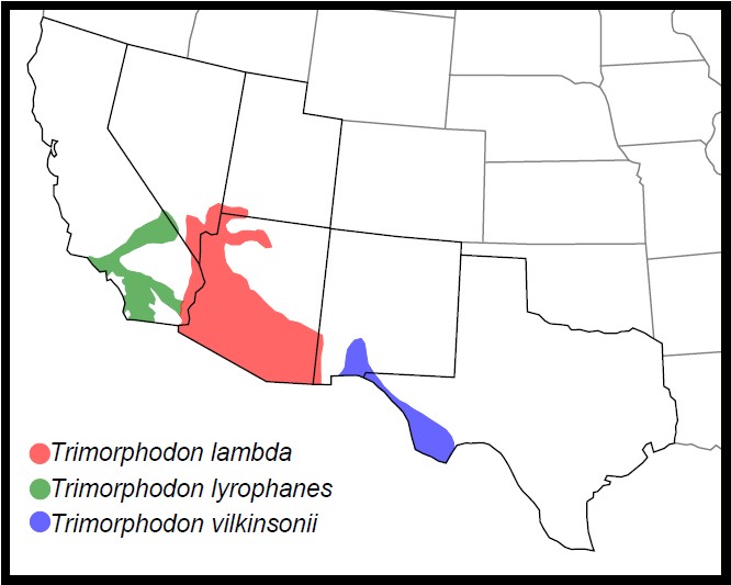 DISTRIBUTION: In our region, Trimorphodon lambda occurs throughout Arizona south of the Mogollon Rim ranges, in the northeastern desert region of Arizona, extreme southern Nevada and eastern California.