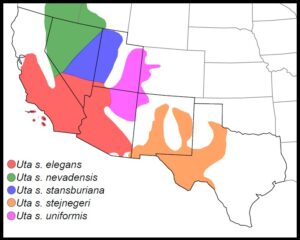 DISTRIBUTION: In our region, Uta s. elegans occurs throughout southern and western Arizona, central and southern California, southern Nevada and extreme southwestern Utah.